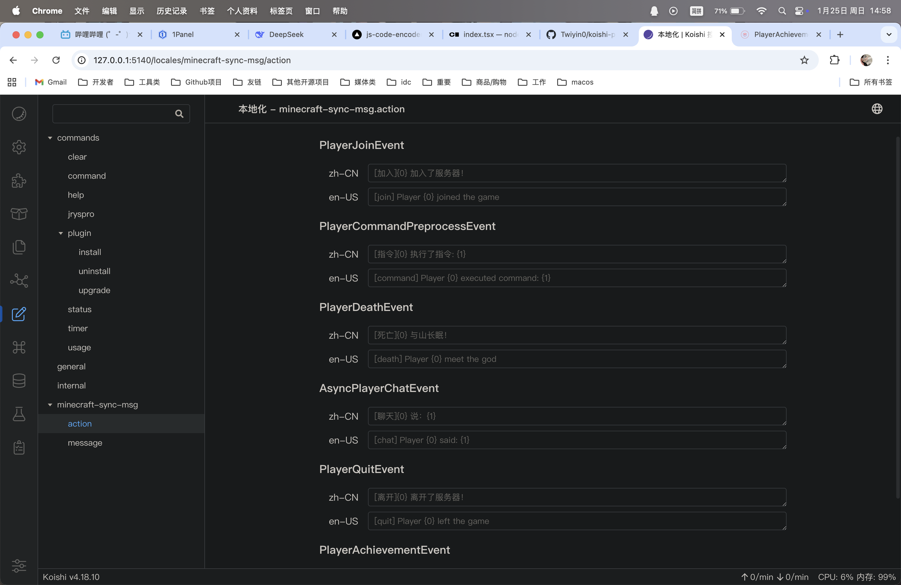 action是mc返回的事件,{0}为玩家名称{1}为对应消息,如聊天内容、执行的命令、成就message是koishi发送到mc服务器的消息前缀,{0}是平台名称{1}是群昵称